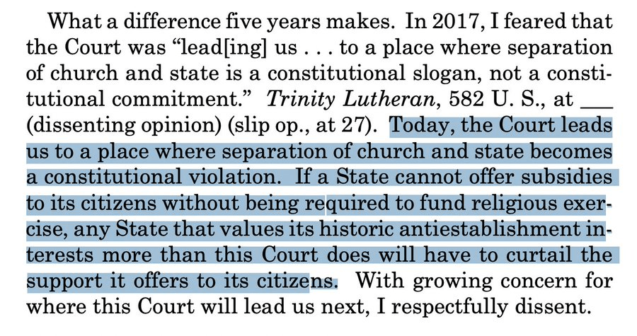 Sotomayor, dissenting: “This Court continues to dismantle the wall of separation between church and state that the Framers fought to build. … The consequences of the Court’s rapid transformation of the Religion Clauses must not be understated.